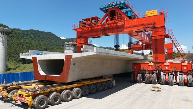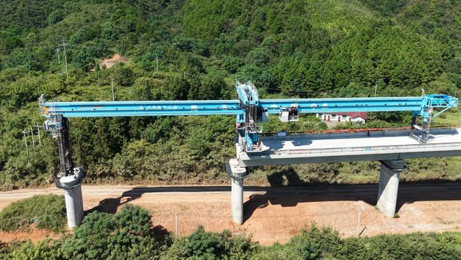 中铁五局邵永铁路东安制梁场内,蓝色架梁机正托起30米长的预制箱梁,准备架设至13号与14号桥墩间,这是当日第二片架设任务。