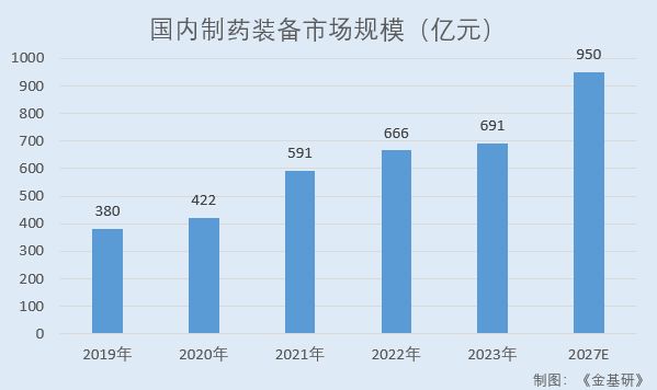 据数据统计,2019-2023年,国内制药装备市场规模分别为380亿元、422亿元、591亿元、666亿元、691亿元,年均复合增长率为16.12%。预计到2027年,国内制药装备市场将达到950亿元。