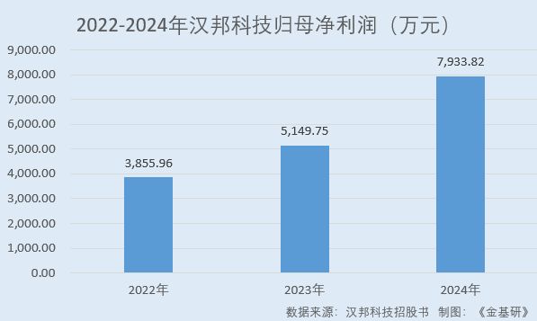 同期,汉邦科技的归母净利润分别为3,855.96万元、5,149.75万元、7,933.82万元,年均复合增长率达43.44%。