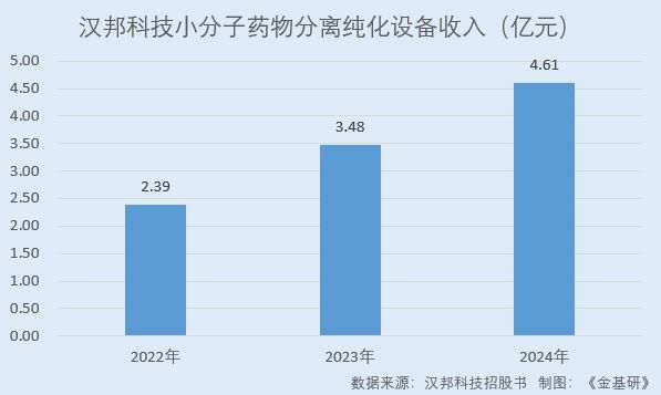据招股书,2022-2024年,汉邦科技小分子药物分离纯化设备收入分别为2.39亿元、3.48亿元、4.61亿元,占主营业务收入的比例分别为49.75%、56.31%、66.70%;大分子药物分离纯化设备收入分别为2.14亿元、2.42亿元、1.93亿元,占主营业务收入的比例分别为44.46%、39.18%、28.00%。