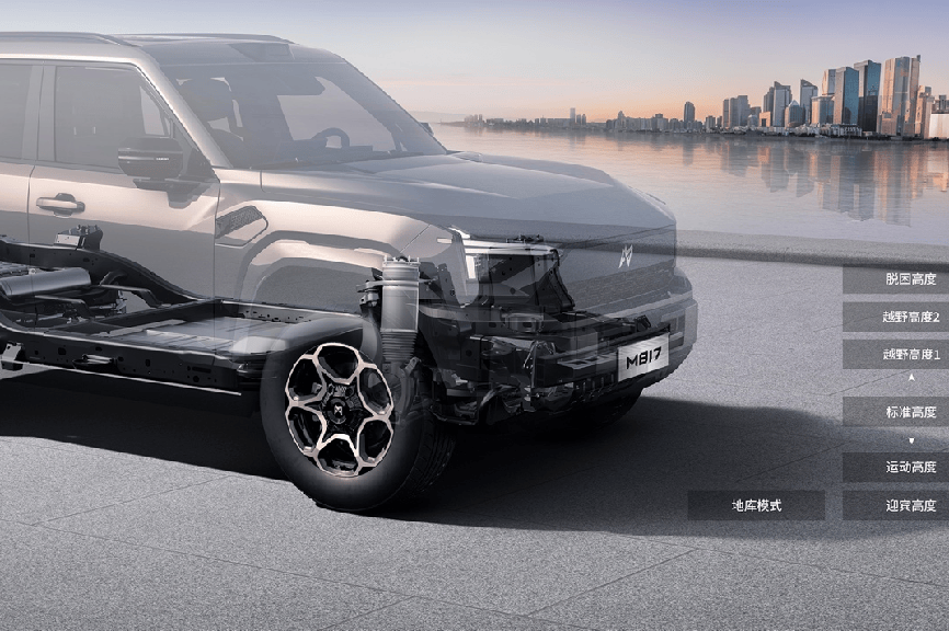 在通过碎石或坑洼路段时,VMC系统还能与空气悬架联动调整底盘高度,使车身重心更稳、侧倾更小、通过性更强。结合CDC连续阻尼可变减振系统对车身姿态的动态调节,整车在陡坡下行、沙地冲坡、岩石穿越等工况中都能保持稳定状态,避免剧烈晃动或底盘磕碰。这种“动态智控”黑科技,正是猛士M817能做到“看似庞大,却能灵活自如”的核心支撑。