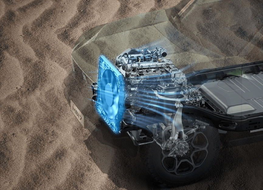 特别值得一提的是,这套系统并不以瞬时爆发为唯一优势,更在长时间、高强度运行中展现出稳定输出能力。猛士M817内置3kW超大功率高压风扇,整体热管理效率提升65%,有效规避电驱系统在连续高负载后降功率的常见弊端。哪怕是沙漠高温冲坡、岩壁持续爬升等极限工况,整车也能保持持久稳定的动力支持,为探索保驾护航。